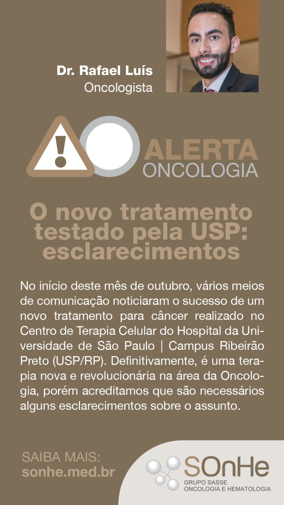 No início deste mês de outubro, vários meios de comunicação noticiaram o sucesso de um novo tratamento para câncer realizado no Centro de Terapia Celular do Hospital da Universidade de São Paulo | Campus Ribeirão Preto (USP/RP). Definitivamente, é uma terapia nova e revolucionária na área da Oncologia, porém acreditamos que são necessários alguns esclarecimentos[...]